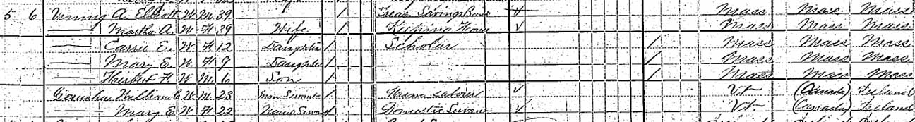 1880 Weymouth, Norfolk County, Massachusetts - dwelling 5, family 6 - Also living in this household in 1880 were William C. Demsha (23, b. VT) and Mary E. Demsha (22, b. VT).: