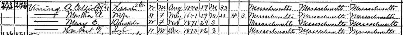 1910 Weymouth, Norfolk County, Massachusetts - dwelling 392, family 438. Martha Anne (White) Vining was living in the household of her son, Herbert F. Vining, in 1910.: