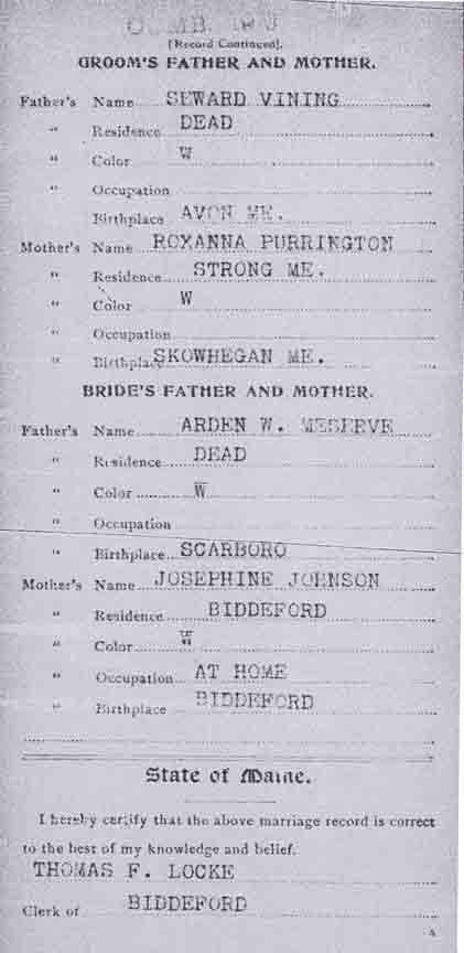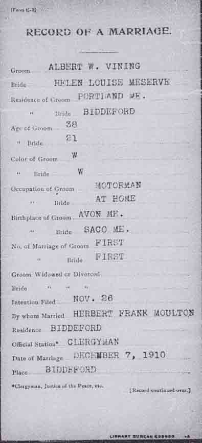 Marriage record for Albert Nelson Vining and Helen Louise Meserve (from Maine State Archives):
