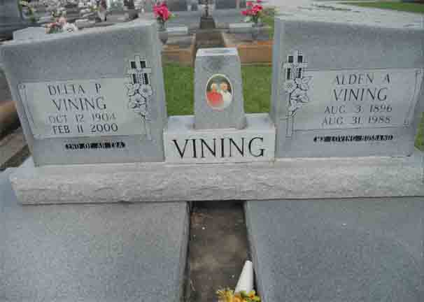 gravestones for Alden Adam Vining and Delta (Pennison) Vining, in Morgan City Cemetery and Mausoleum, Morgan City, Saint Mary Parish, Louisiana (from Find A Grave):