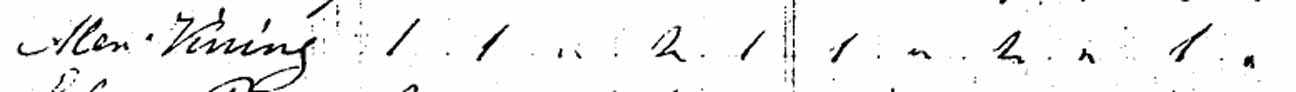 | Alexander Vining Jr. | M under 16 | M 16–26 [see note below] | M 26–45 married [and living in this household?] [see note below] | M 26–45 married [and living in this household?] [see note below] | married and living in separate household |