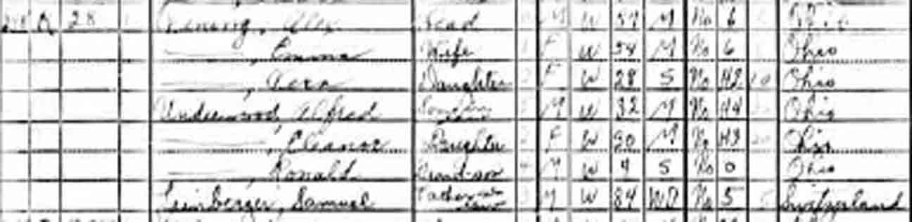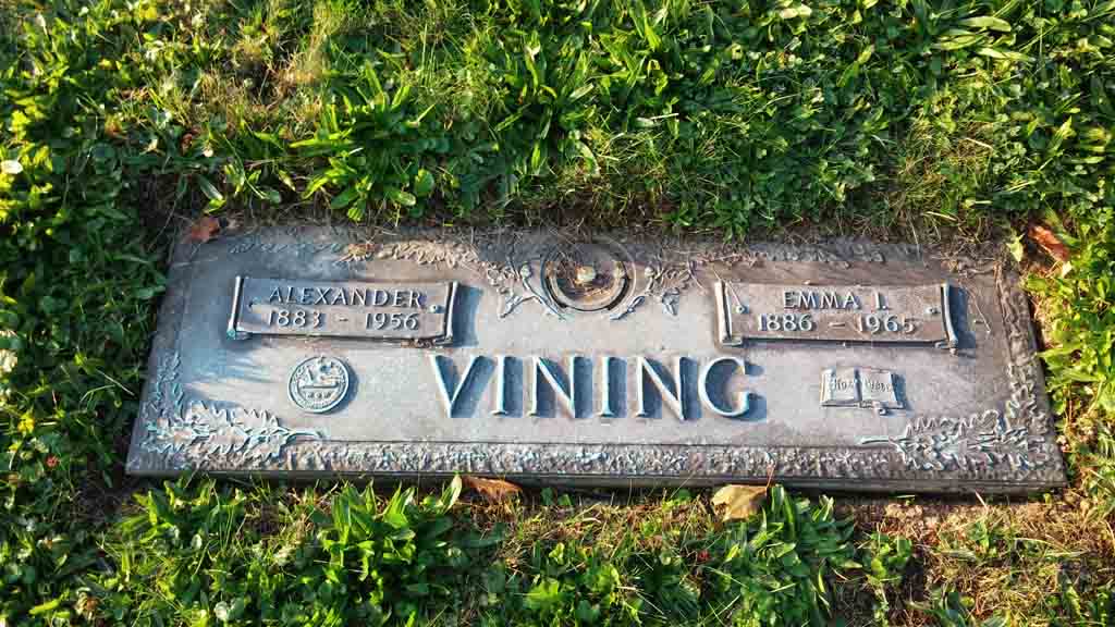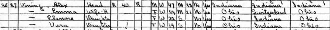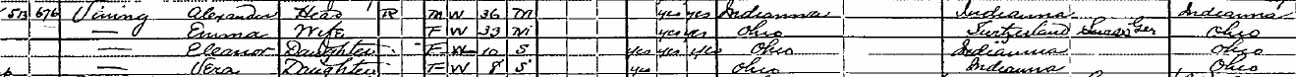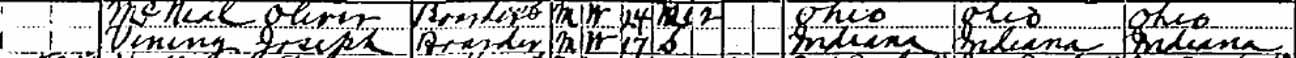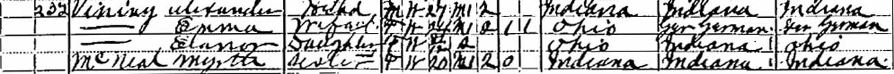 1910 Cleveland (ward 2), Cuyahoga County, Ohio - dwelling 201, family 232. Also living in this household in 1910 were Myrtle McNeal (sister of Alexander Vining, 20 y., b. Indiana), Oliver McNeal (husband of Myrtle (Vining) McNeal, 24 y., b. Ohio), and Joseph Vining (brother of Alexander Vining, 17 y., b. Indiana).: