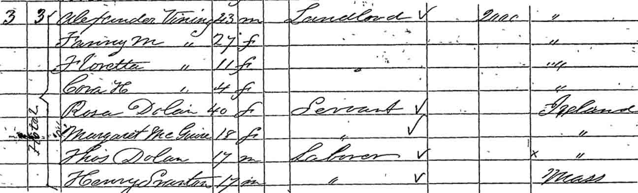 1860 Hull, Plymouth County, Massachusetts - dwelling 3, family 3. Also living in this household (a hotel) in 1860 were Rosa Dolan (40 y., b. Ireland), Margaret McGuire (18 y., b. Ireland), Thomas Dolan (17 y., b. Ireland), and Henry [S[c]ranton?] (17 y., b. Massachusetts).: