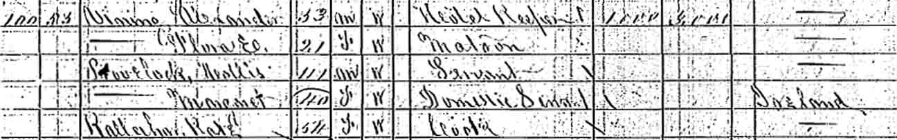 1870 Hull, Plymouth County, Massachusetts - dwelling 100, family 55. Also living in this household (a hotel) in 1870 were Hollis Lovelock ([41? y.], b. Massachusetts), [...] Lovelock (40 y., b. Ireland), and Kate "Kallerher" (54 y., b. Ireland).: