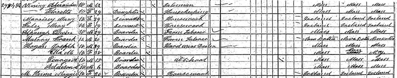 1880 Quincy, Norfolk County, Massachusetts - dwelling 298, family 486. Also living in this household in 1880 were Mary Marrisey (29 y., b. Ireland), Mary Faley (19 y., b. Ireland), Edwin Alpaugh (29 y., b. Massachusetts), Frank Malony (20 y., b. Nova Scotia), Joseph Hagan (39 y., b. Massachusetts), Ella M. Hagan (38 y., b. Massachusetts), George A. Hagan (15 y., b. Massachusetts), Addison C. Hagan (6 y., b. Massachusetts), and Maggie McKenna (20 y., b. Ireland).:
