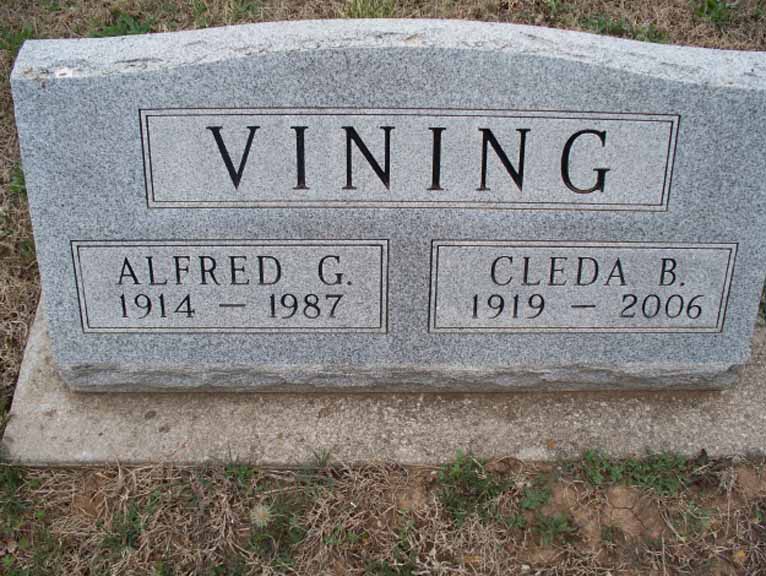 Headstone for Alfred Gilbert Vining and Cleda B. Lancaster, in Robbins Cemetery, Fawn Creek Township, Kansas (from Find A Grave):