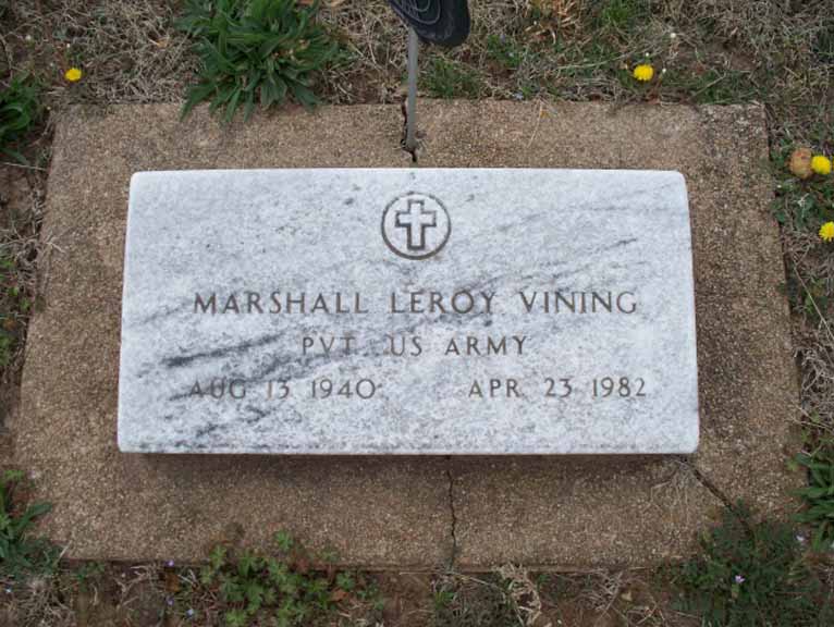 Gravestone for Marshall Leroy Vining, son of Alfred Gilbert Vining and Cleda B. Lancaster, in Robbins Cemetery, Fawn Creek Township, Kansas (from Find A Grave):