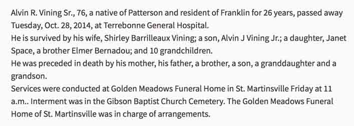 Documentation for Alvin Raymond Vining Jr. - Shirley Mae Barrilleaux