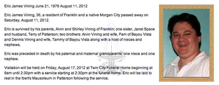 Obituary for Eric James Vining, son of Alvin Raymond Vining Jr. and Shirley Mae (Barrilleaux) Vining: