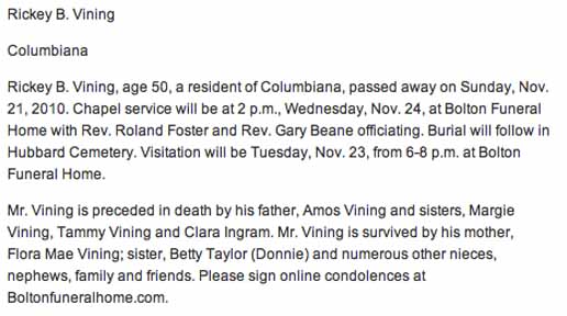 Headstone for Amos Boyd Vining and Flora Mae (McDonald) Vining, in Hubbard Cemetery, Shelby County, Alabama (source: Find A Grave):