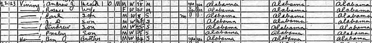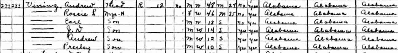 1920 Kingdom (precinct 1), Bibb County, Georgia - dwelling 22, family 23. Also living in this household in 1920 was Ben Vining (24 y., b. Alabama), a brother of Andrew J. Vining.: