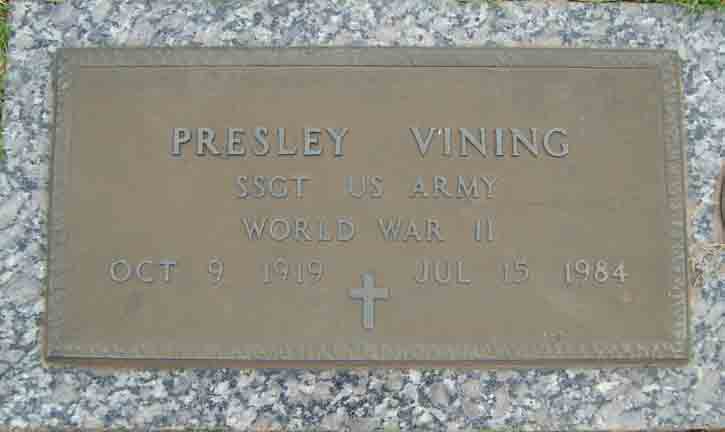 Gravestone for Presley Vining, son of Andrew J. Vining and Rosace L. ([…]) Vining, in Pine View Memorial Gardens, Wetumpka, Elmore County, Alabama (from Find A Grave):