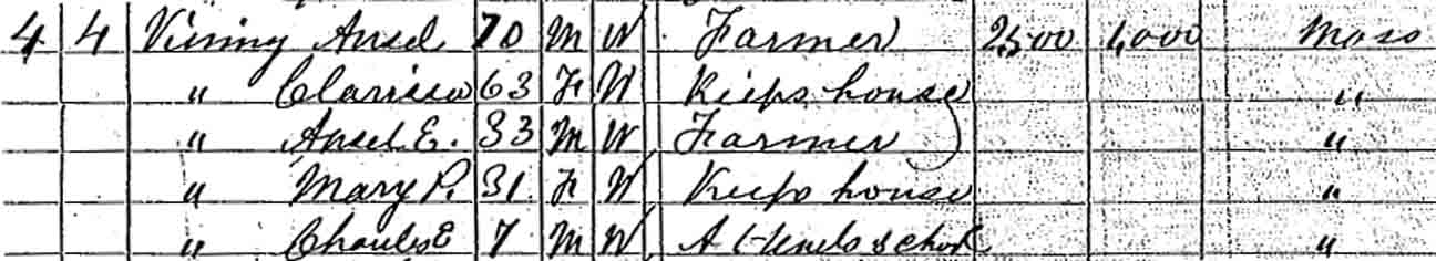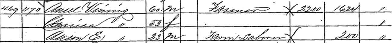 | Ansel Emerson Vining | M Under 5 | 13 | 23 | 33 [see note below] | married and living in separate household | |