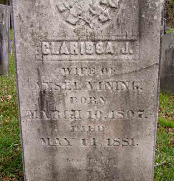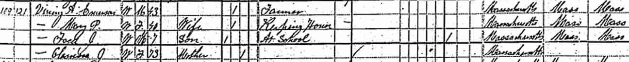 1880 Windsor, Berkshire County, Massachusetts - dwelling 109, family 121. In 1880, Clarissa (Joslin) Vining was living in the household of son Ansel Emerson Vining.: