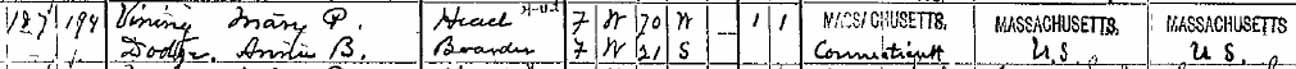 1920 Williamsburg, Hampshire County, Massachusetts - dwelling 74, family 79. Mary P. was living with son Frederick J. Vining in 1920.: