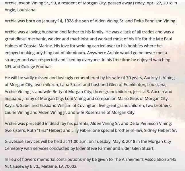 Obituary for Archie Joseph Vining (from website of Twin City Funderal Home; Morgan City, Louisiana):