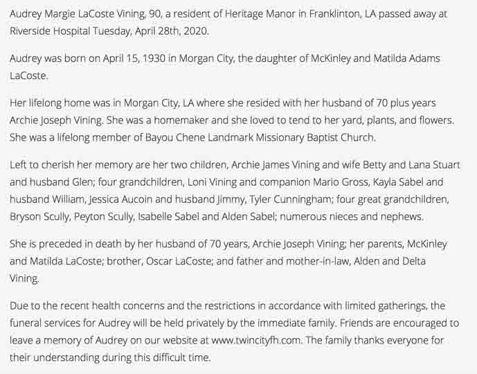 Obituary for Audrey Margie (LaCoste) Vining (from website of Twin City Funderal Home; Morgan City, Louisiana):