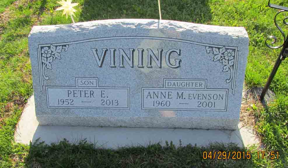 Headstone for Peter Edwin Vining and Anne M. (Vining) Evenson, children of Arthur L. Vining - Betty P. ([…]) Vining, in Rushford Lutheran Cemetery, Rushford, Fillmore County, Minnesota (from Find A Grave):