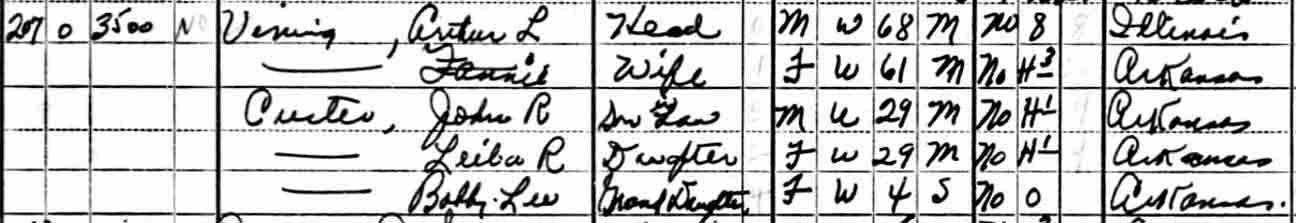 1940 Little Rock, Pulaski County, Arkansas. By 1940, Lela Ruth was married, to John Custer, and she and he and their daughter were living in the household of her parents.: