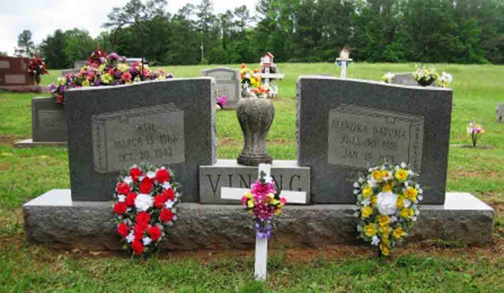 Gravestones for Artie Vining and Elenora Nayoma (Hall) Vining, in Mount Pleasant Cemetery, Holland Gin, Limestone County, Alabama (from Find A Grave):