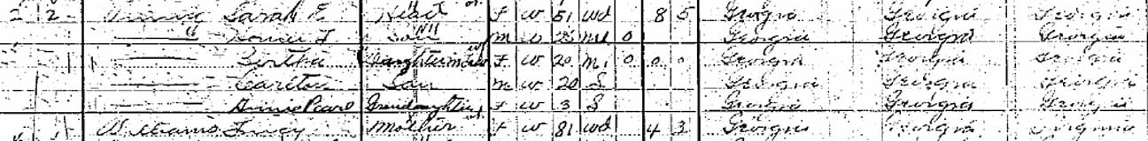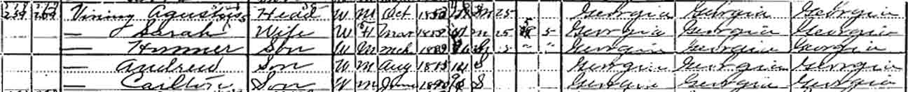 According to the 1910 census, Homer T. Vining [Thomas Homer Vining] ("son" of Sarah Elizabeth Vining) was reported to be married ("M1", meaning his first marriage) 0 years. In the same household was Bertha Vining ("daughter in law" of Sarah Elizabeth Vining), also married ("M1") 0 years. Also in the household was Annie Pearl Vining, a "grandaughter" [sic] of Sarah E. Vining. Now, Annie Pearl was reported to be 3 years old, and Bertha was reported to have been the mother of "0" children. The question, then, is who are the parents of Annie Pearl? Note: the only other members of the household in 1910 were Lucy Williams (81 y., widowed, the "mother" of Sarah Elizabeth Vining) and Carlton Berry Vining (20 y., single, a "son" of Sarah Elizabeth Vining).← Back to Augustus Gallatin Vining - Sarah Elizabeth Williams