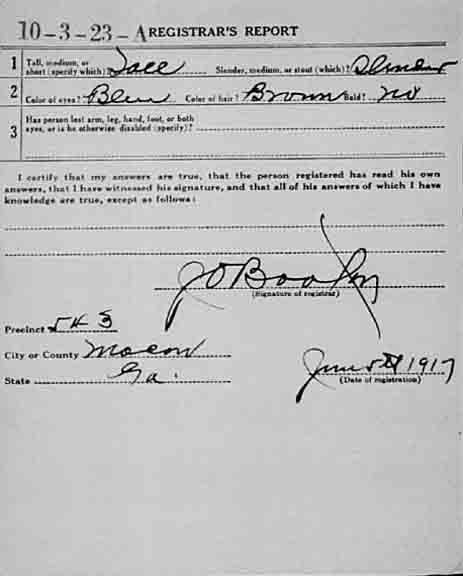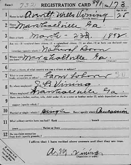 World War I registration card for Averett Wells Vining: