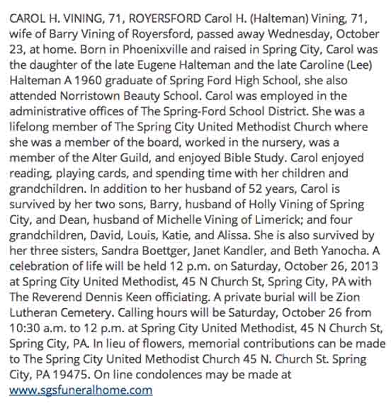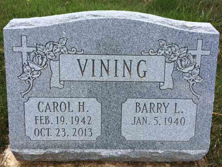 Headstone for Barry L. Vining and Carol Jean (Halteman) Vining, in Zion Lutheran Church Cemetery, Spring City, Chester County, Pennsylvania (from Find A Grave):
