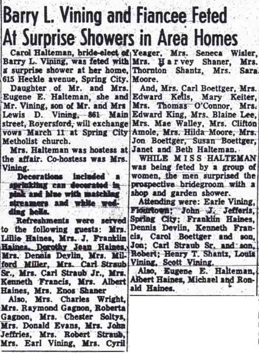 Surprise wedding showers for Barry L. Vining and Carol Jean Halteman (from Pottstown Mercury, 8 February 1961, page 10, columns 4 and 5):