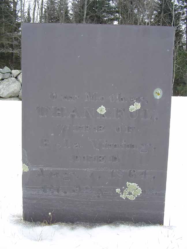 1850 Durham, Cumberland County [Durham is now in Androscoggin County], Maine - dwelling 122, family 136. In 1850, Thankful (Millbanks) Vining was living in the household of son William. It is unlikely, however, that she was 87 years old in 1850.: