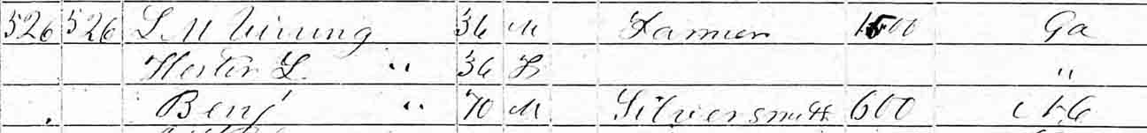 1850 Cherokee County, Texas - dwelling 526, family 526. In 1850, Benjamin Vining was living in the household of son Lewis Milton Vining and wife Hester L.: