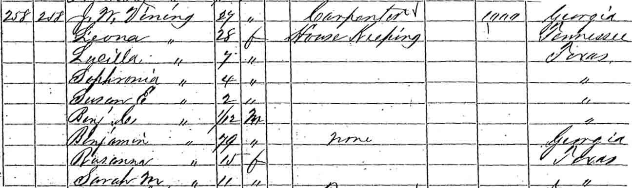 1860 Rusk post office (Beat #2), Cherokee County, Texas - dwelling 258, family 258. In 1860, Benjamin Vining was living in the household of grandson Joseph W. Vining.: