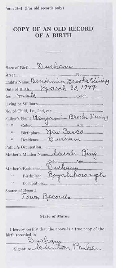 Birth record for Benjamin Brooks Vining (from Maine State Archives):