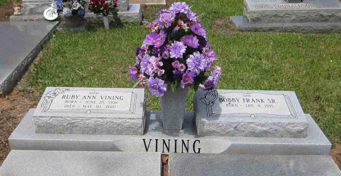 Headstone for Bobby Frank Vining and Ruby Ann (Simpkins) Vining, in West Sunnyside Community Church Cemetery, Spalding County, Georgia (from Find A Grave):