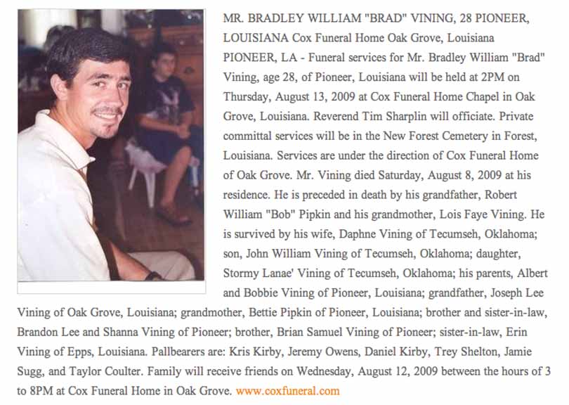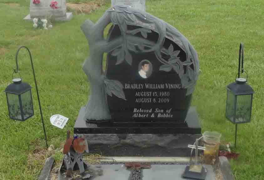 Gravestone for Bradley William Vining, in New Forest Cemetery, Forest, West Carroll Parish, Louisiana (from Find A Grave):