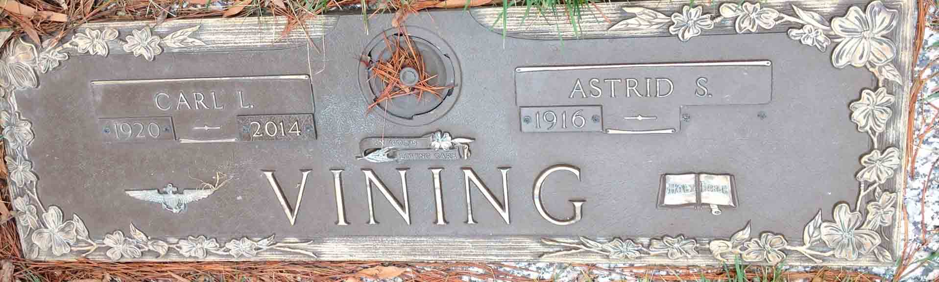 Headstone for Carl Louis Vining and Astrid Emma (Strom) Vining, in Arlington Memorial Gardens, Mount Healthy, Hamilton County, Ohio (from Find A Grave):