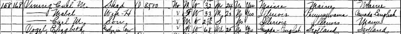 1930 Milton Township, DuPage County, Illinois - dwelling 158, family 168. Also living in this household in 1930 was Elizabeth Vogel (68 y., Canada), the widowed mother of Mabel Catherine (Vogel) Vining.: