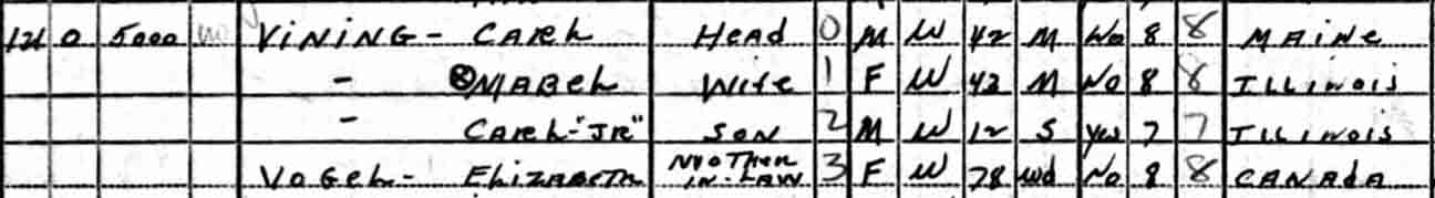 1940 Wheaton, Milton Township, DuPage County, Illinois. Also living in this household in 1940 was Elizabeth Vogel (78 y., Canada), the widowed mother of Mabel Catherine (Vogel) Vining.: