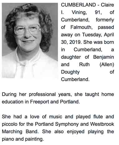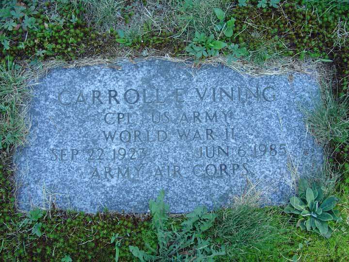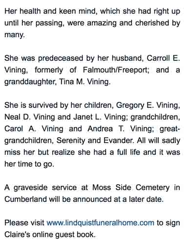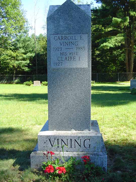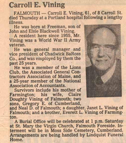 Obituary (likely from the Portland [Maine] Press Herald) for Carroll Edward Vining. Following the obituary are pictures of the headstone for Carroll Edward Vining and Claire Isabel Doughty and the military gravestone of Carroll Edward Vining. These stones are in the Moss Side Cemetery in Cumberland, Cumberland County, Maine.