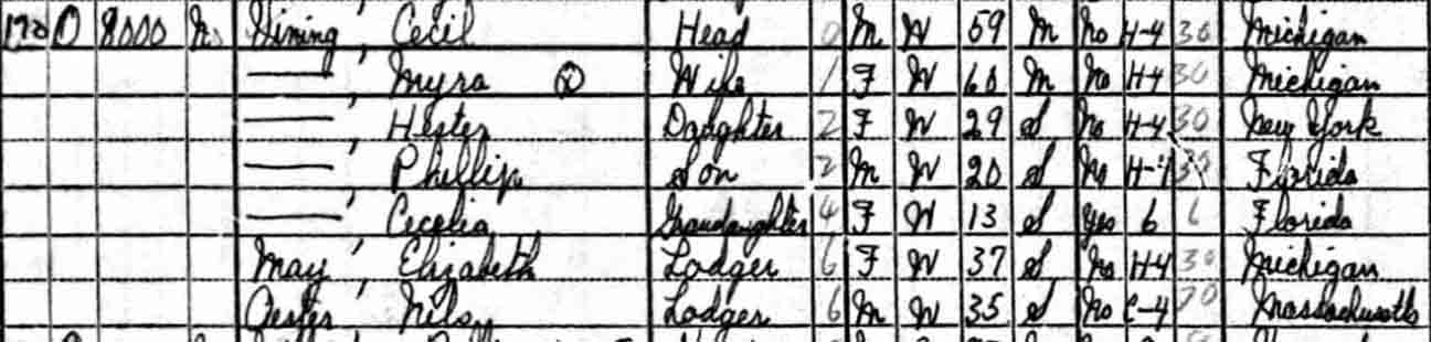 1940 Daytona Beach, Volusia County, Florida. Also living in this household in 1940 was granddaughter Cecelia Vining (13 y., b. Florida), daughter of son Wesley Keith Vining.: