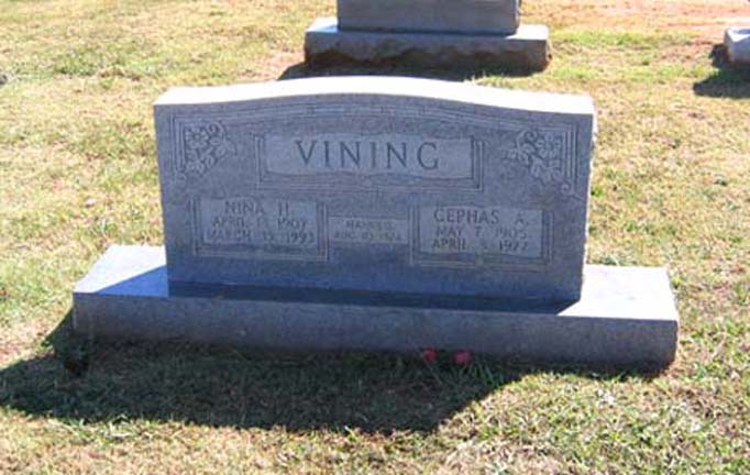 Headstone of Cephas Andrew Vining and Nina Ruth (Hargrove) Vining in Athens City Cemetery in Athens, Limestone County, Alabama (from Find A Grave):