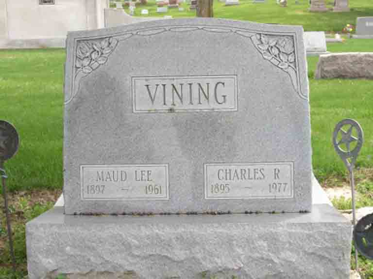 Headstone for Charles Russell Vining and Maud Lee ([…]) Vining, son and daughter-in-law of Charles Vining and Catharine (Overmyer) Vining, in Harris-Elmore Union Cemetery, Elmore, Ottawa County, Ohio (from Find A Grave):