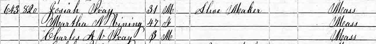 1850 Weymouth, Norfolk County, Massachusetts - dwelling 643, family 820. Josiah Pray was the widower of Susan Augusta (Vining) Pray, and Charles A. V. Pray was likely the son of Josiah and Susan.: