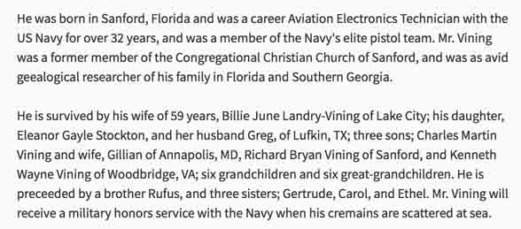 Obituary for Charles Andrew Vining (from Find A Grave website):