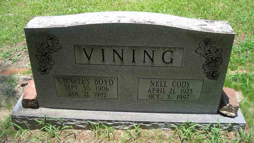 Headstone for Charles Boyd Vining and Nell (Cody) Vining, in Fairview Cemetery, Eufaula, Barbour County, Alabama (from Find A Grave):