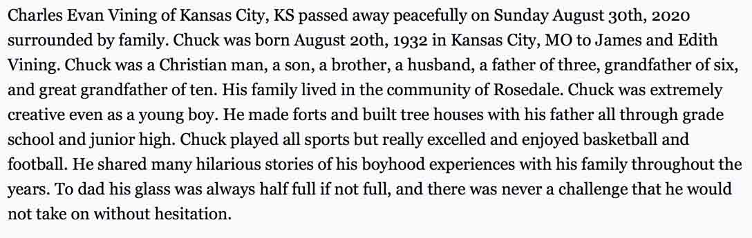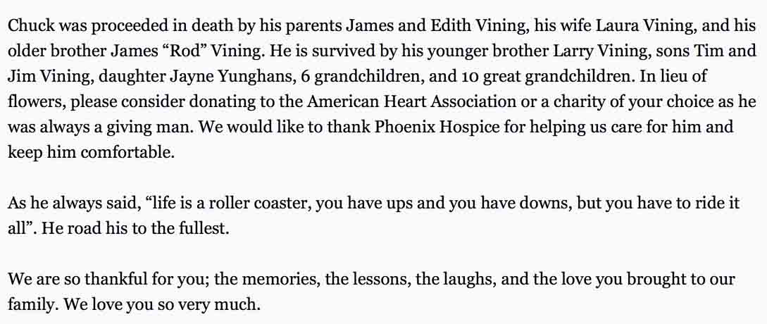 Obituary for Charles Even Vining, from the website of Penwell-Gabel Funderal Home. Thursday, 4 May 2006 issue.