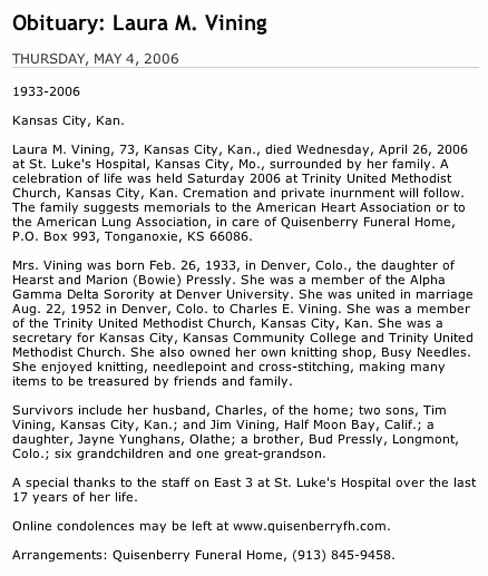 Obituary for Laura M. (Pressly) Vining, from the Bonner Springs-Edwardsville Chieftain (online posting), Bonner Springs, Kansas; Thursday, 4 May 2006 issue.