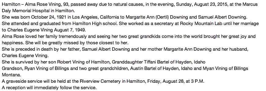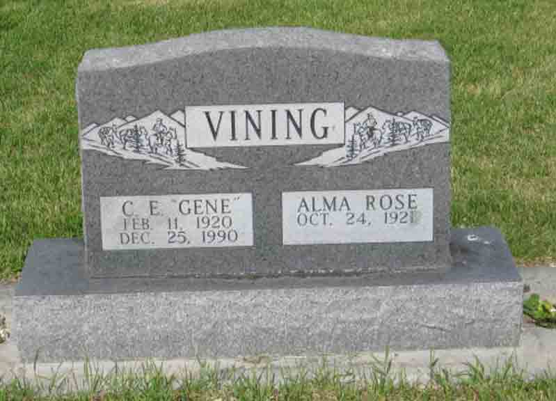 Headstone for Charles Eugene Vining and Alma Rose (Downing) Vining, in Riverview Cemetery, Hamilton, Ravalli County, Montana (from Find A Grave):