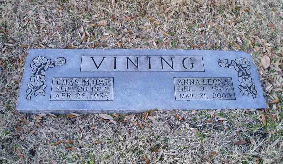 Headstone for Charles Macon "Pat" Vining and Anna Leona (Banks) Vining, in Laurel Land Memorial Park, Dallas, Dallas County, Texas (from Find A Grave):