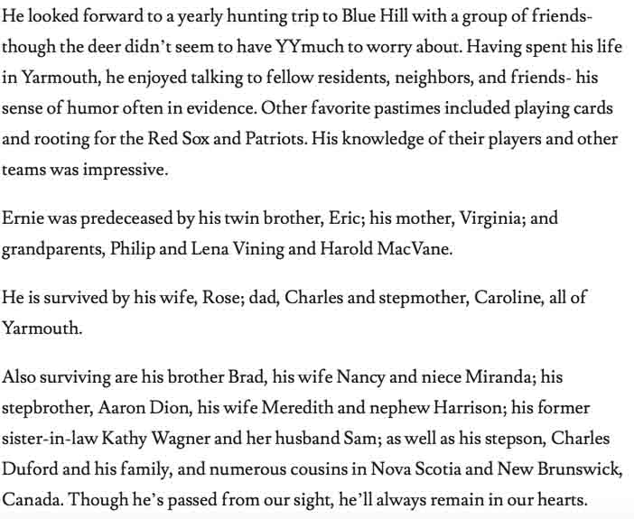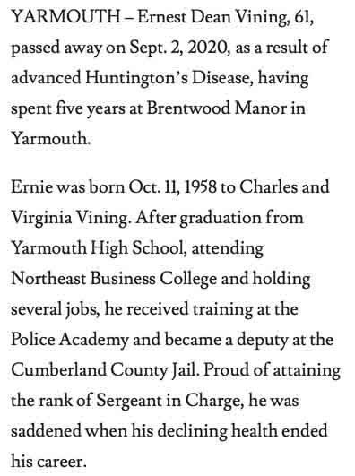 Obituary for Ernest Dean Vining Vining, son of Charles M. Vining and Virginia M. MacVane: