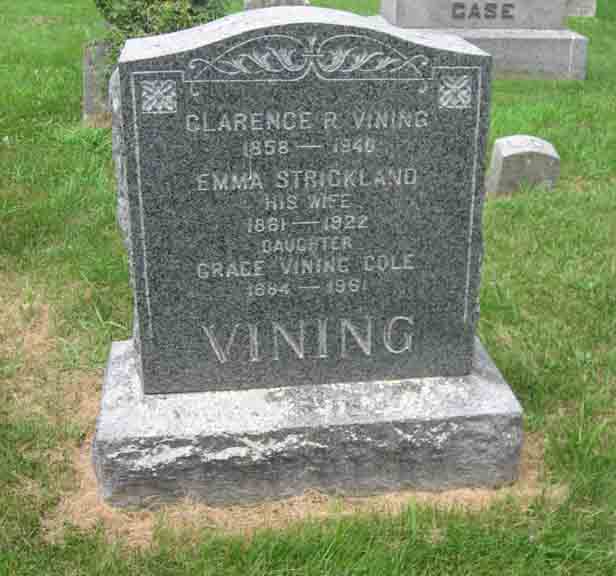 Headstone for Clarence Ruggles Vining, Emma J. (Strickland) Vining, and daughter Grace (Vining) Cole, in North Canton Cemetery, North Canton, Hartford County, Connecticut (from Find A Grave):